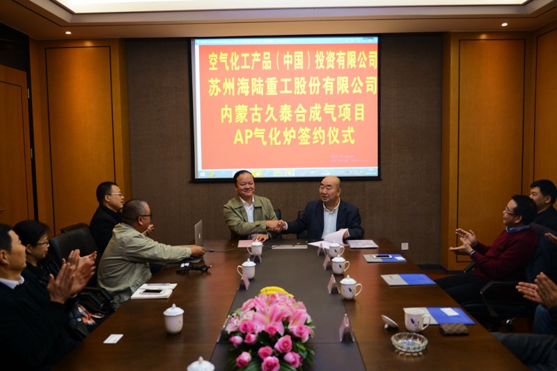 2018年12月6日下午,在海陸重工會議室,空氣化工產品(中國)投資有限公司與蘇州海陸重工股份有限公司,舉行久泰合成氣項目AP氣化爐簽約儀式,AP公司采購總監戴曉輝與海陸重工鍋爐事業部總經理陳吉強分別在簽約書上簽字